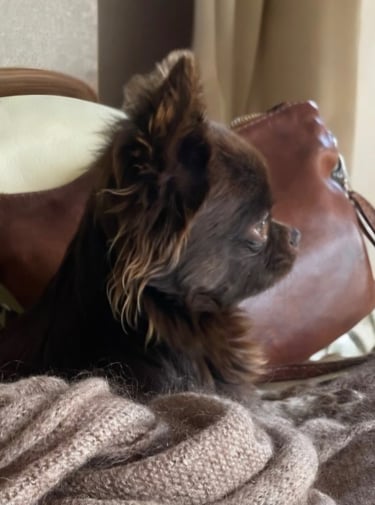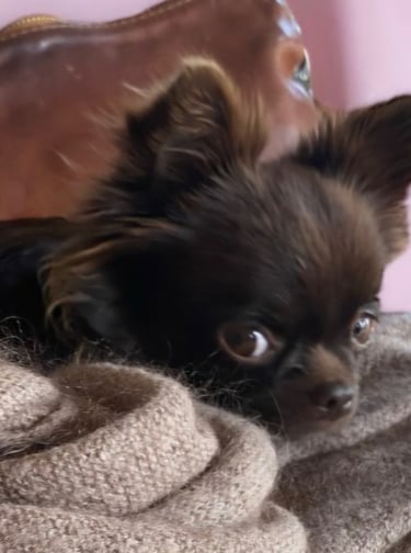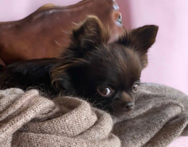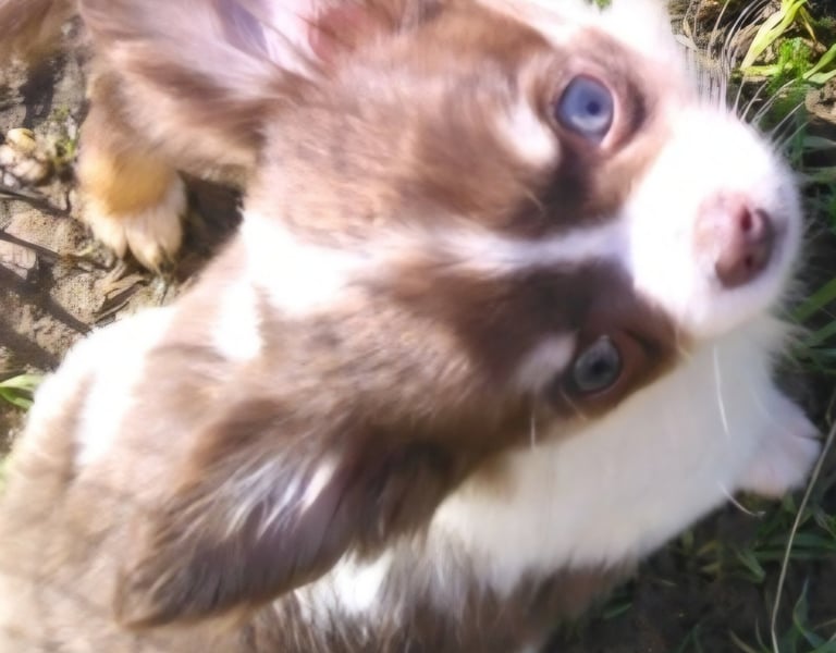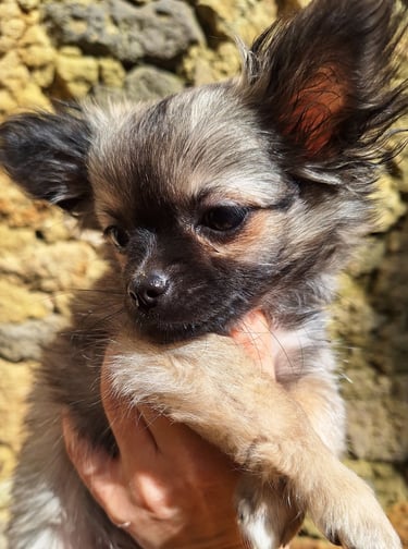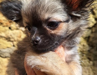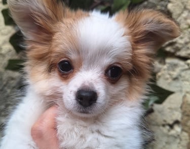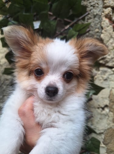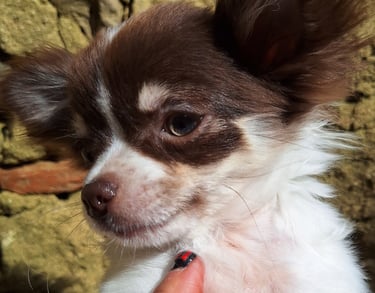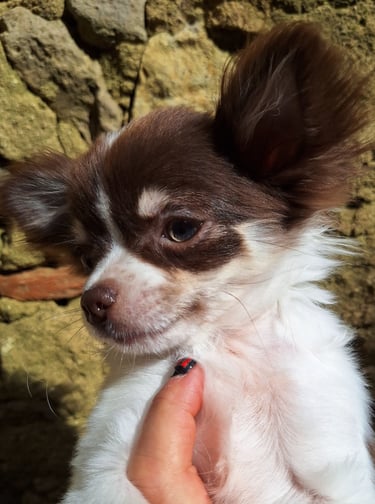 Noisette ( femelle Chihuahua poil long chocolat , tan et blanche)